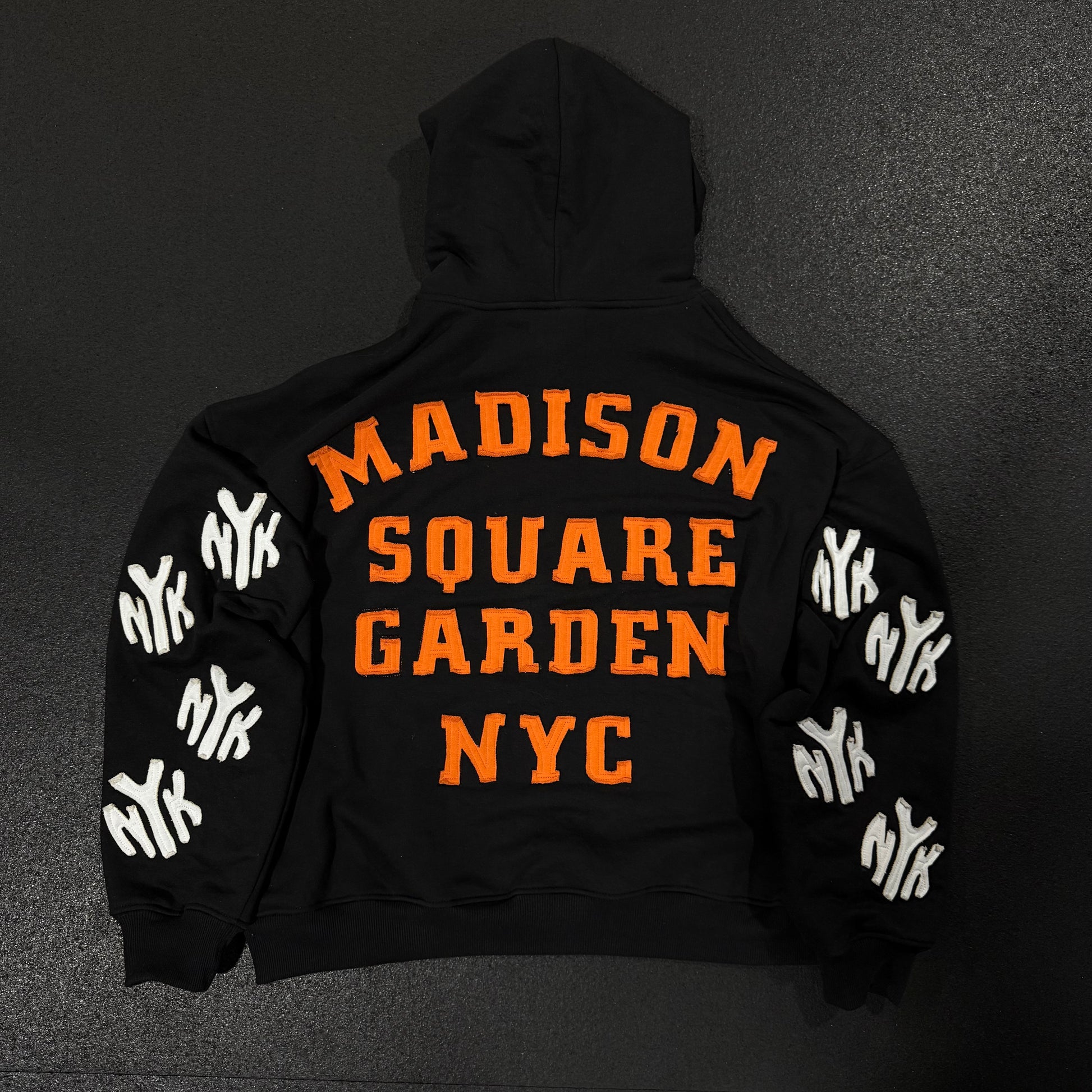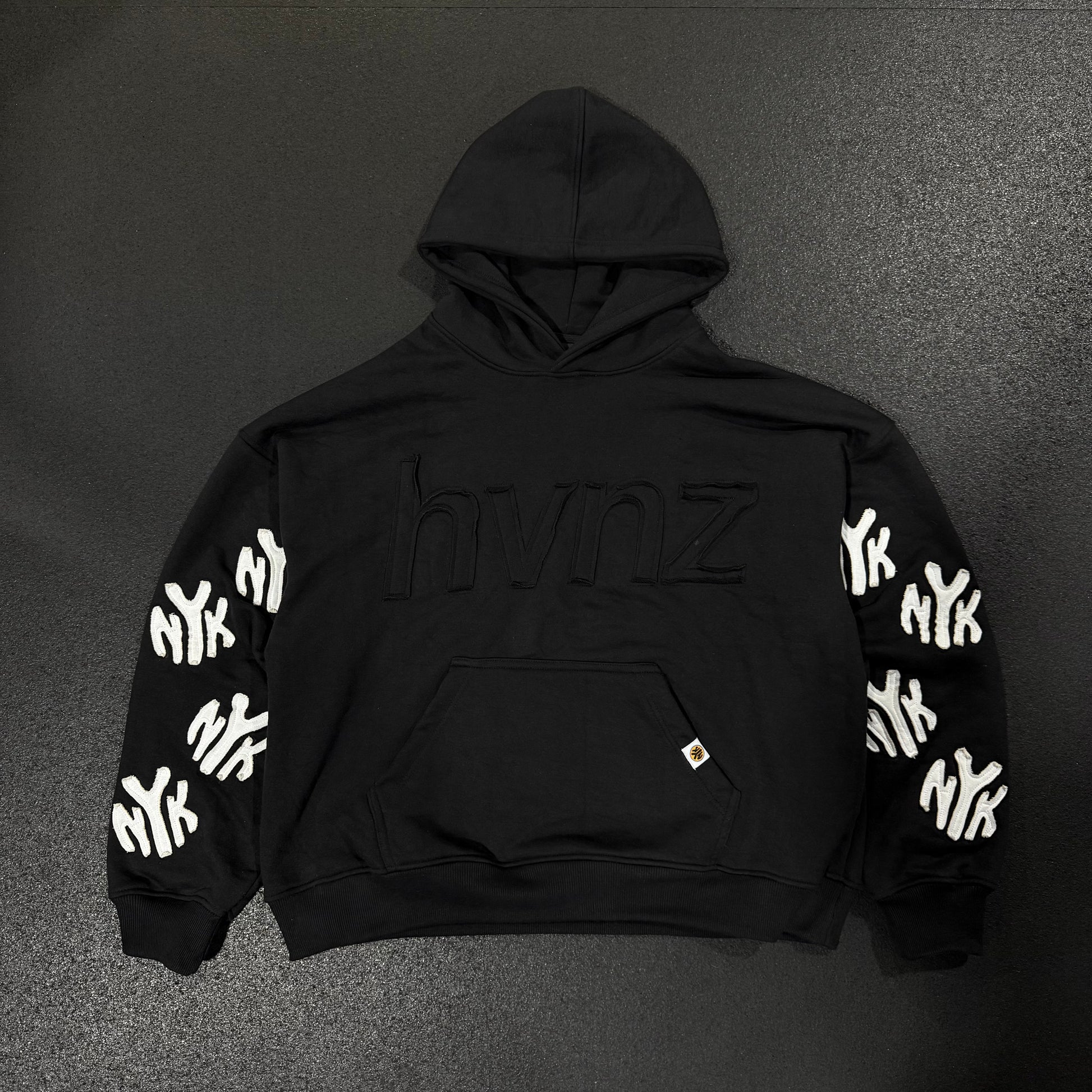 This hoodie is crafted from premium 450 GSM 100% Cotton French Terry (55oz), offering a relaxed oversized fit that stays true to size. The hidden side pockets keep the front sleek, while the French Terry applique on the sleeves adds rich texture and intricate detail, making the design truly stand out.
